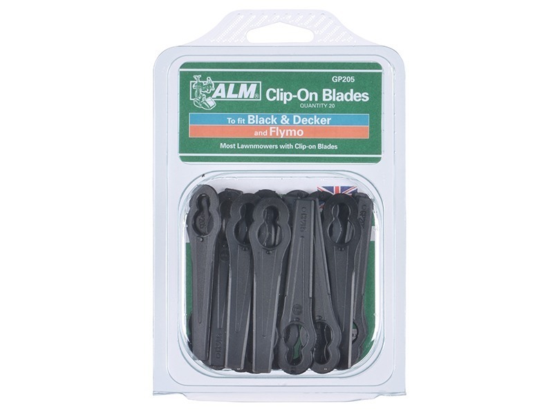 The ALM Manufacturing GP205/FIQ8 Clip-on Blades to fit Flymo and Black & Decker early model lawnmowers with a figure 8 type mounting.