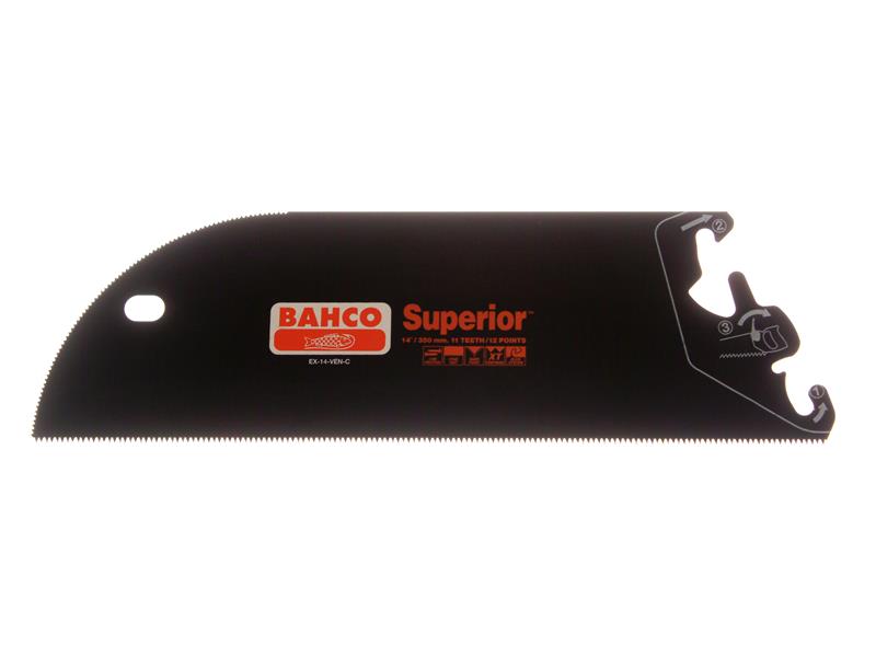 The Bahco EX-14-VEN-C Superior™ Veneer Saw Blade made for cutting fine to medium-thick materials such as plywood, laminates and plastics. Unique XT-teething, hardpoint teeth provide long-lasting sharpness. The curved, toothed nose for starting cuts in the middle of the surface of the work piece. The thicker blade allows for high-precision and straight cutting with exceptionally good stability and comfort. It also features a low-friction, rust-protective coating.