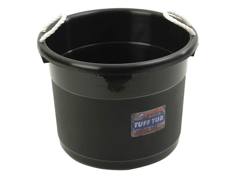 Large capacity black bucket made from polypropylene with two rope handles. Useful for storage of many household or industrial items both indoors or out. Ideal for transporting equipment or waste materials.