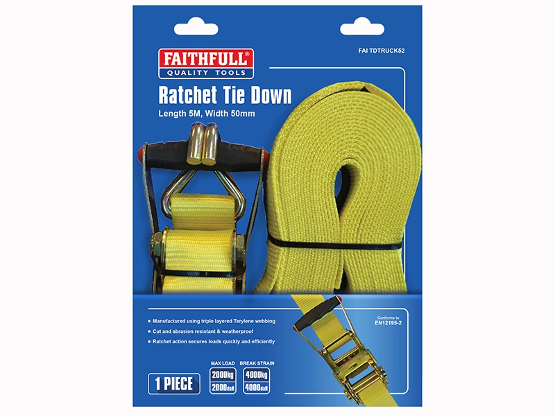 These Faithfull heavy-duty 50mm wide ratchet straps are designed to secure really heavy loads. Manufactured from a 50mm wide triple layer Terylene webbing they are weatherproof, cut and abrasion resistant. The ratchet and J-style fixing hooks ensure that loads are secured quickly and efficiently and provide ease of use.