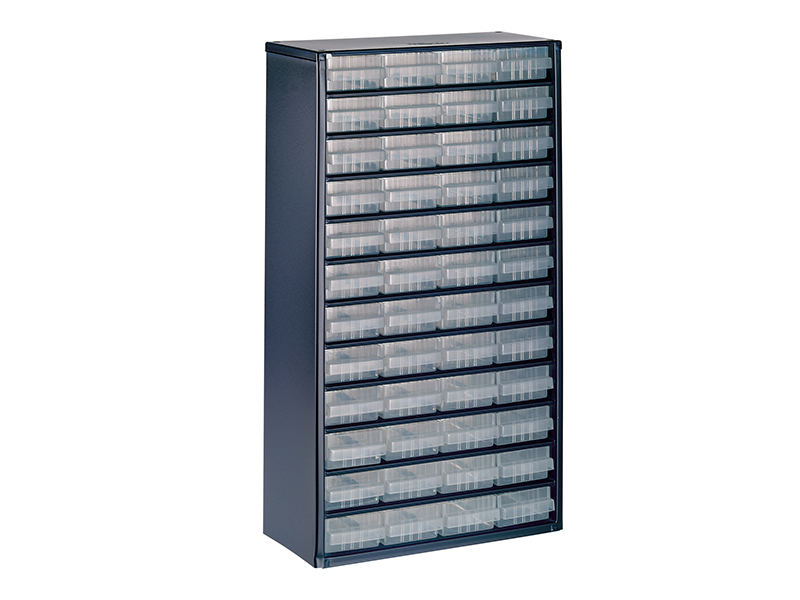 The Raaco 1248-01 Metal Cabinet has 48 drawers, each drawer can be divided into 16 compartments. The cabinet is made of painted steel and the drawers are made of polypropylene (PP).