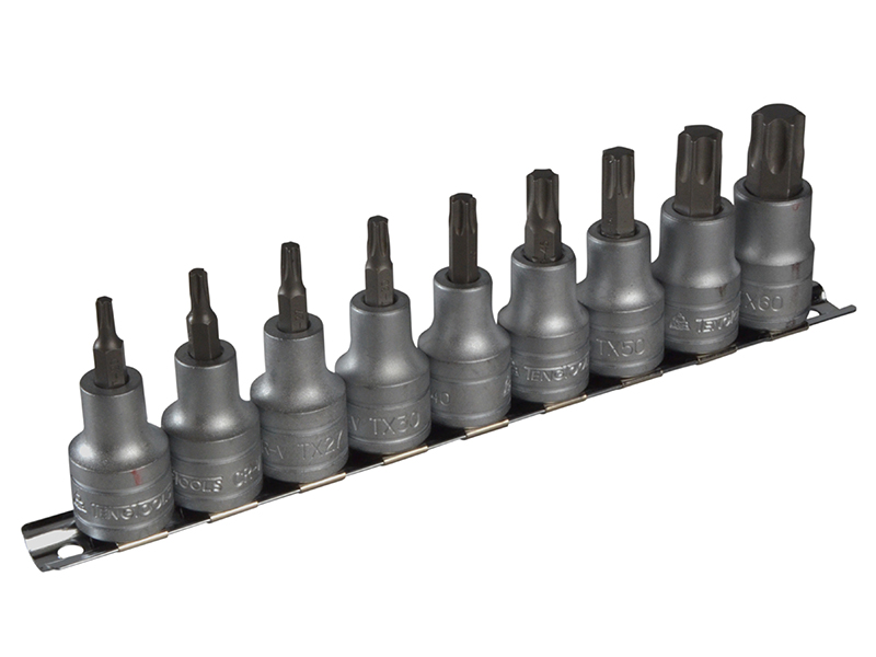 This Teng Tools 9-piece Socket Clip Rail Set consists of 1/2inch drive bit sockets for internal TORX heads.